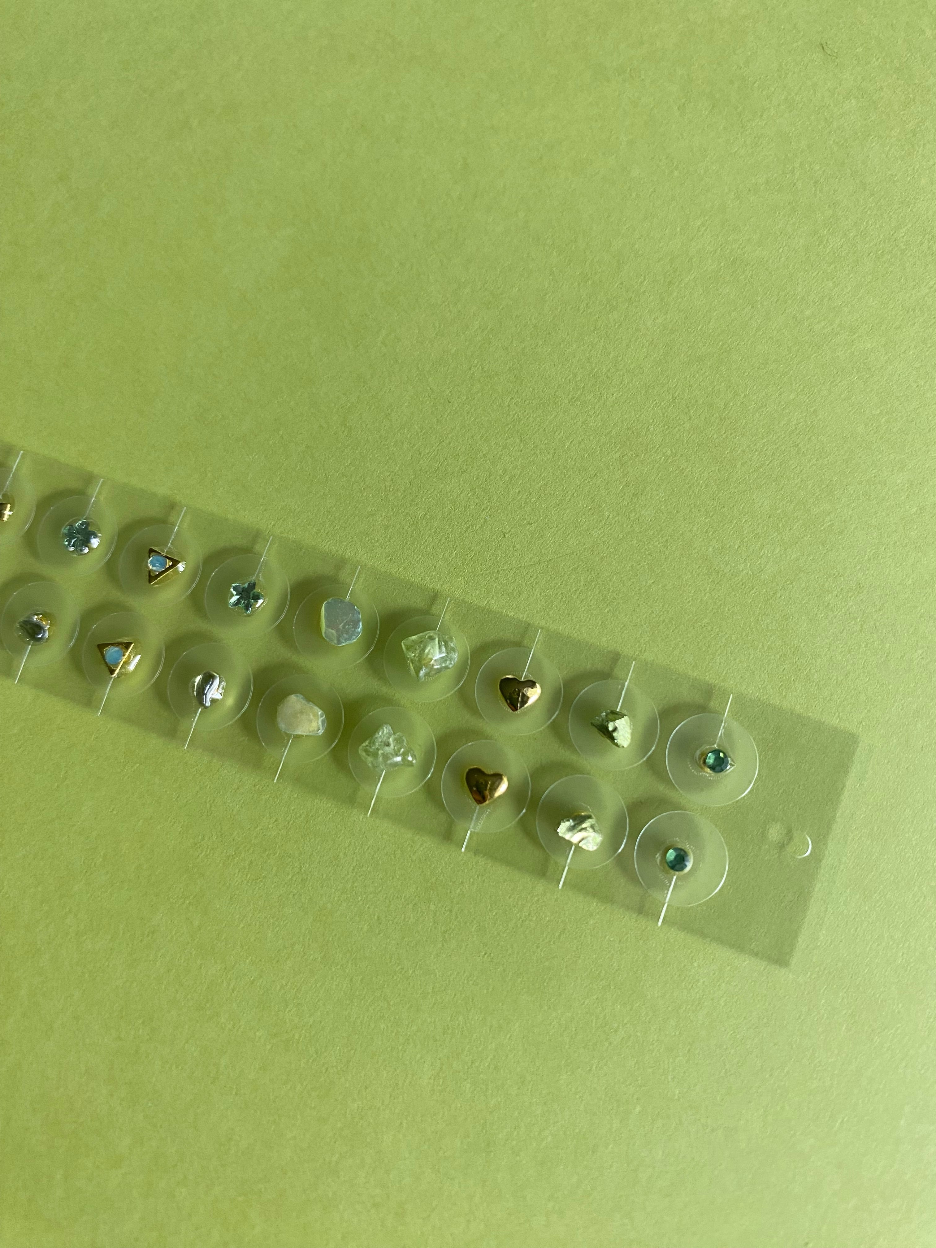 爽やかなライトグリーンと上品なゴールドの組み合わせが、春の軽やかさを感じさせる耳つぼジュエリー。推しカラーの黄緑を取り入れたい方にもぴったりのデザインです。