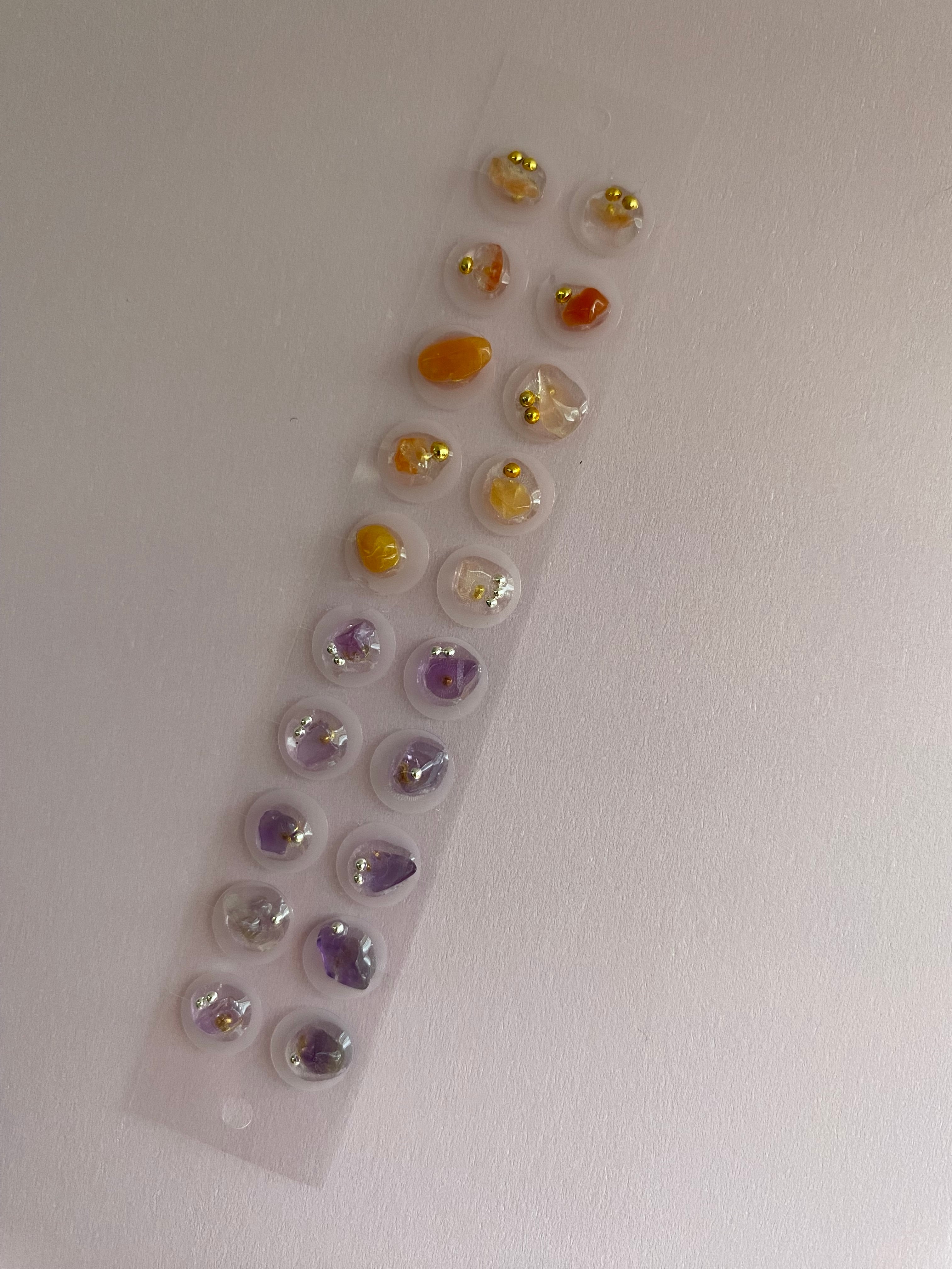 アベンチュリンは穏やかさや癒しを、アメジストは直感や心のバランスをサポートするといわれ、どちらも日常に寄り添う石。1枚で複数の使い方ができるため、耳つぼジュエリー初心者さんから上級者さんまで満足いただけます。