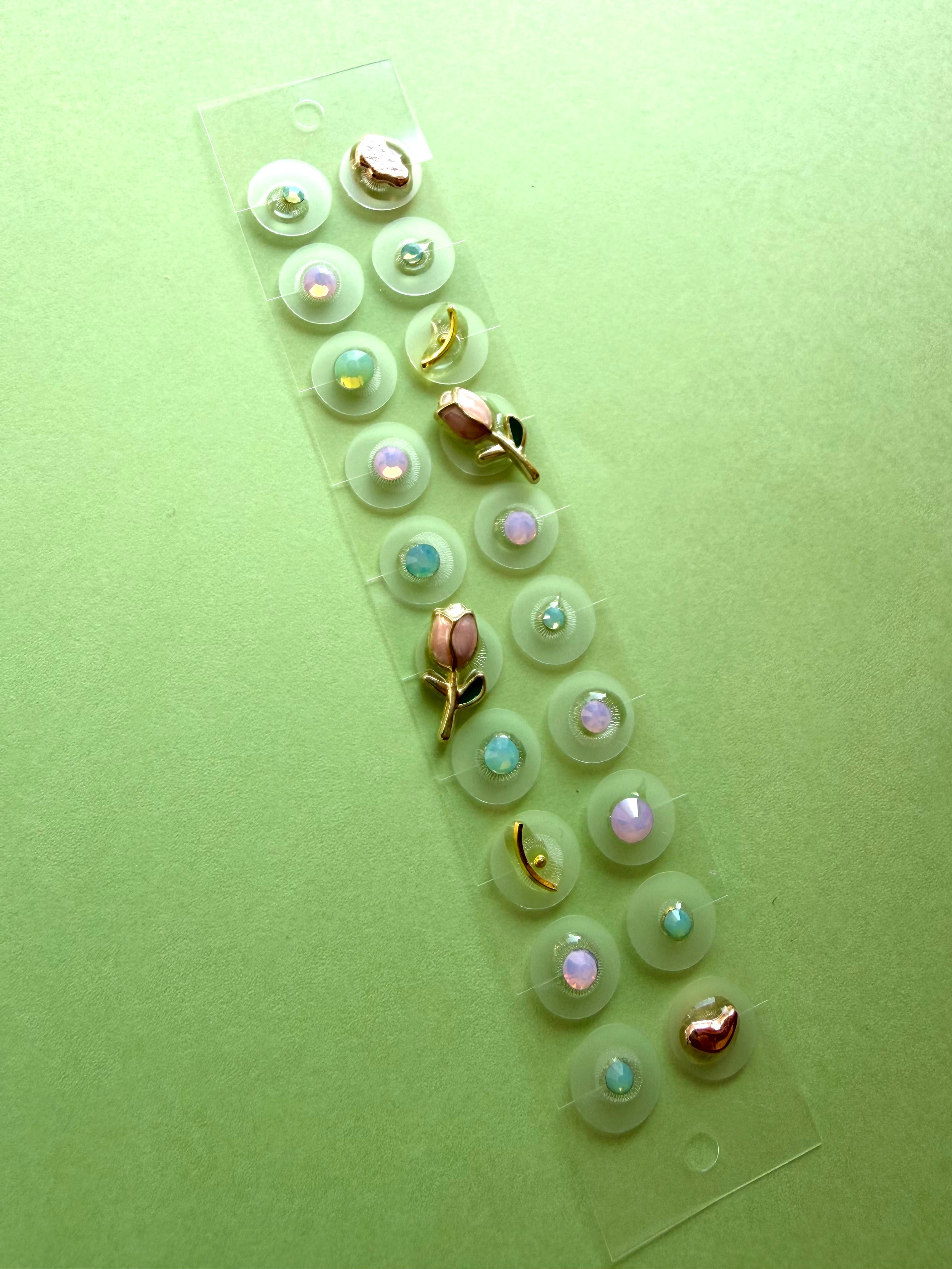 グリーンとピンクのストーンがやさしく寄り添い、春の空気をまとったような色合いに仕上げました。